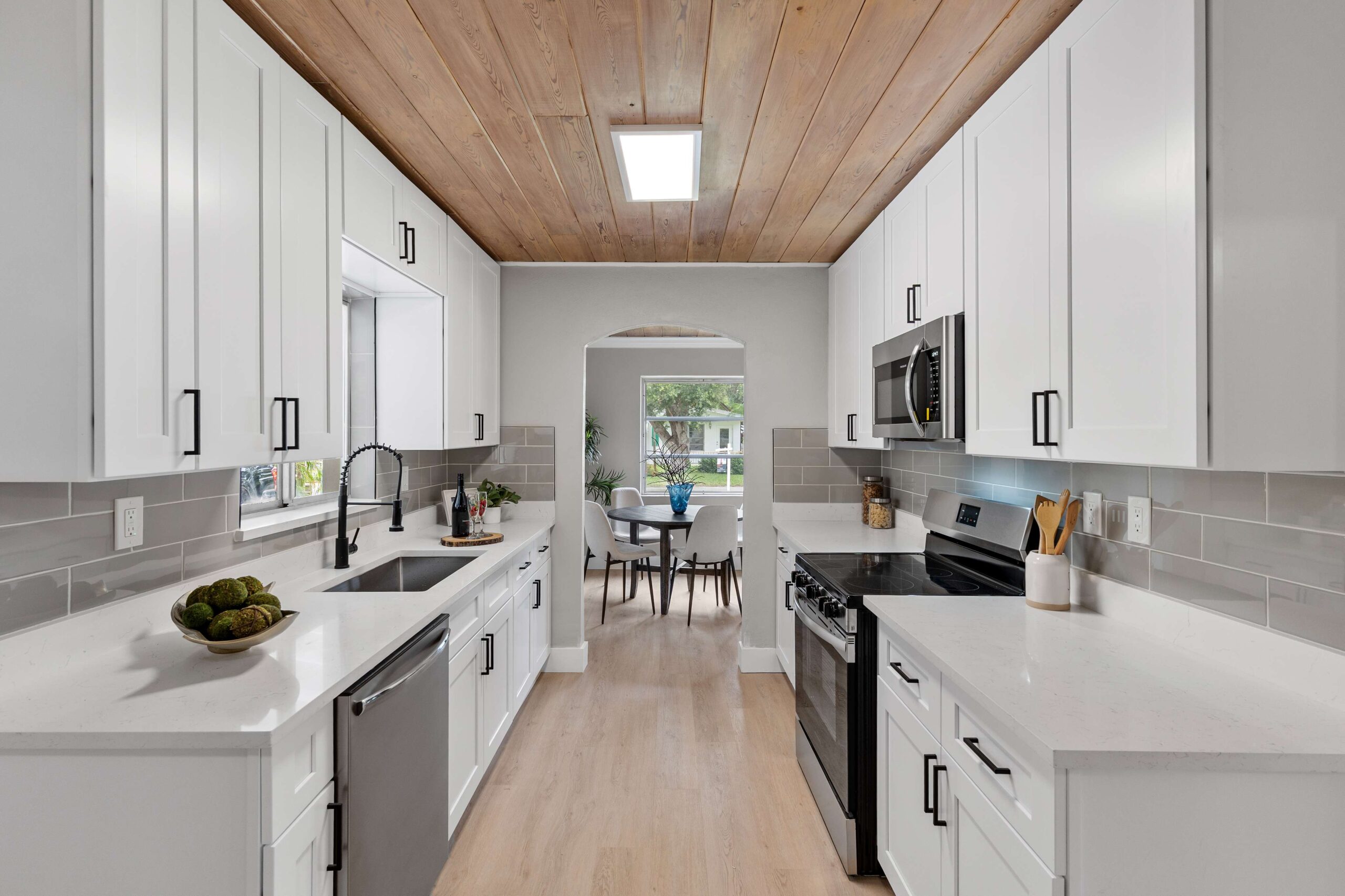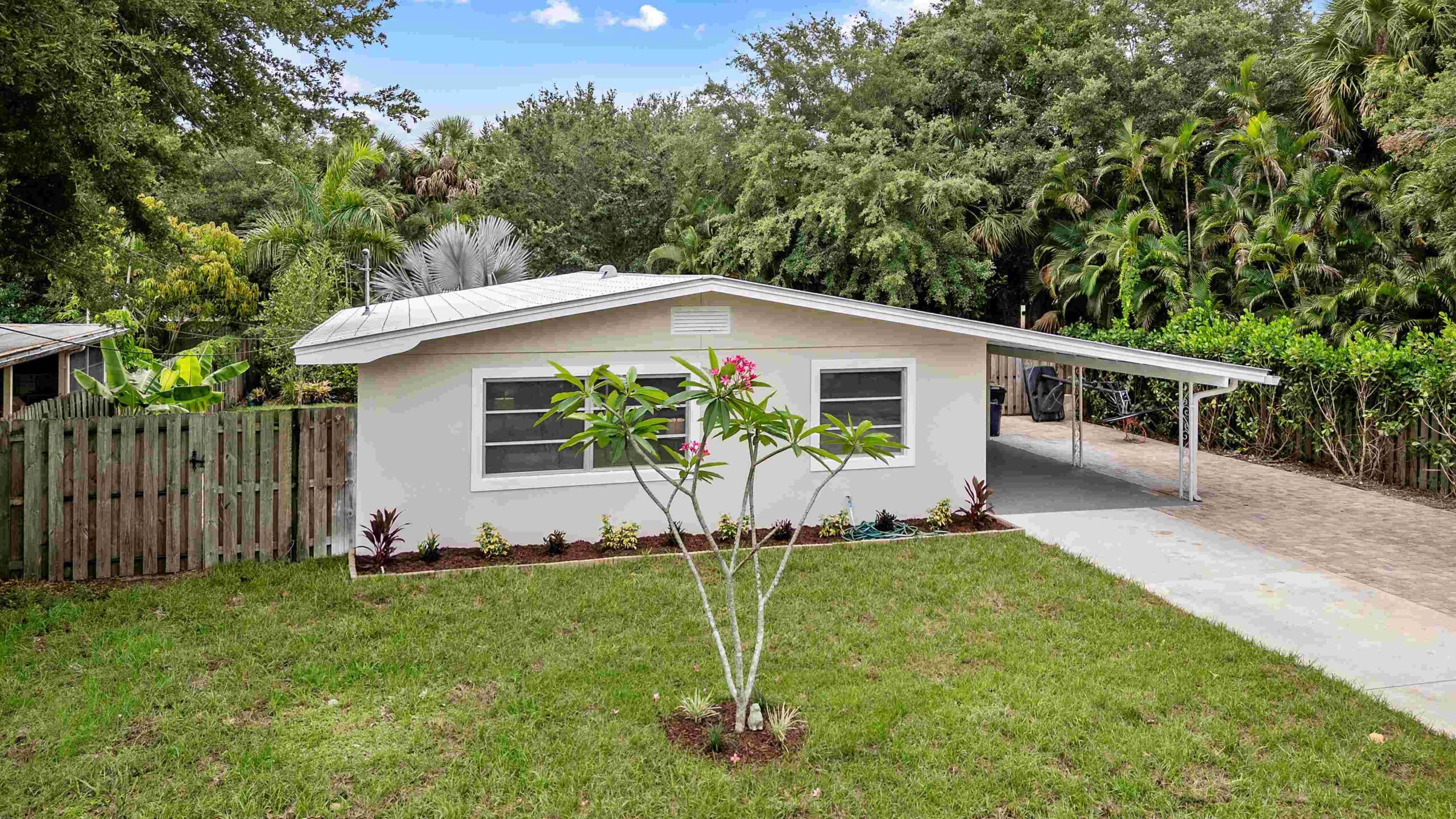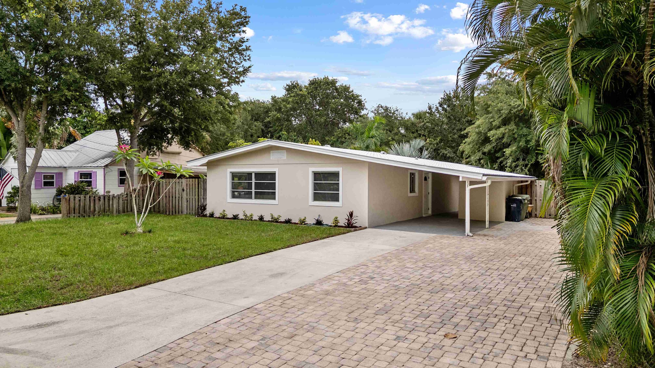Welcome to this charming renovated two bedroom, one bathroom home situated in a prime location in a vibrant community. This home is just moments away from downtown Stuart’s boutique shops, cafes, and waterfront dining options. Whether you are seeking a charming residence or a vacation rental investment, this property presents a compelling option. There are no HOA restrictions, plenty of parking, and a 2019 Metal roof. The hardwood ceilings with crown molding are complimented by brand new white shaker cabinets and quartz countertops which give a fresh modern ambiance. The outdoor bar and shower in a pristine garden setting appeal to the nature enthusiast.